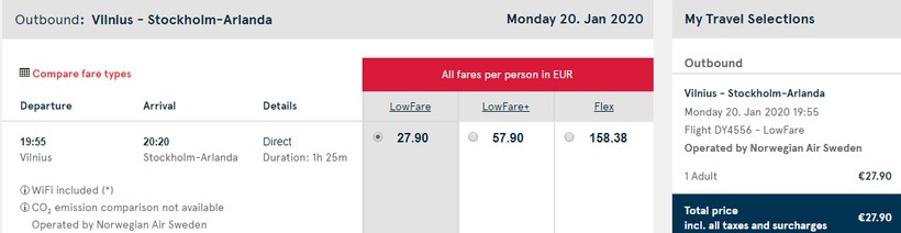 Расписание данной норвежской компании не могу назвать удобным. Лайнеры до Стокгольма отправляются ежедневно, за исключением нескольких дней в неделю (допустим, в феврале 2020 года отсутствуют рейсы по вторникам и субботам). Вылетать предстоит вечером. Пассажирам предлагают разные тарифные планы: