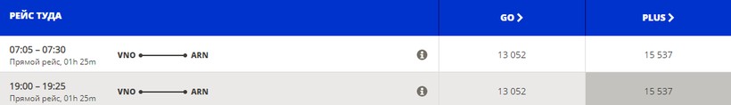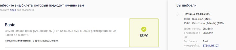 У латвийской компании нет прямых рейсов из Вильнюса до Стокгольма, она перевозит своих клиентов транзитом через Ригу. Минимальное время перелета составляет всего 2,5 часа. Предусмотрен дневной вылет.