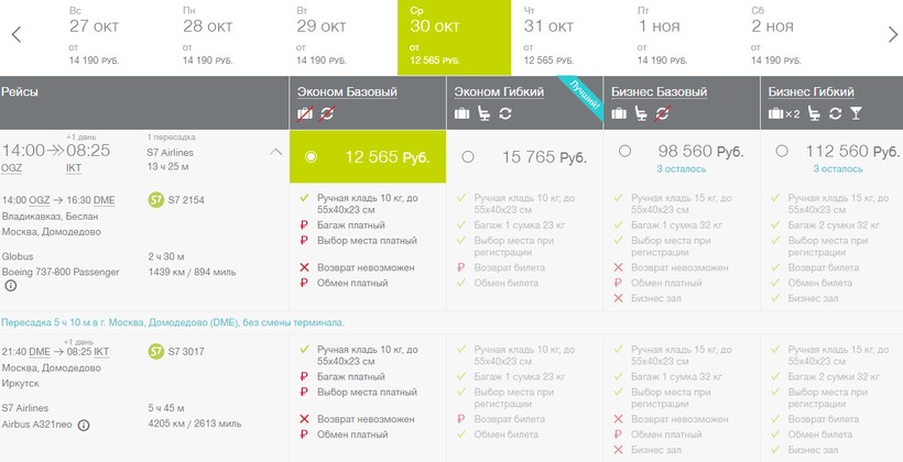 Цены действуют при покупке на ближайшие даты и примерно за 1 месяц до вылета. И как раз у S7 я могу рекомендовать оформлять билеты заранее, потому что купить их минимум за 1,5 месяца до авиапутешествия можно только туда за 16000 ₽.