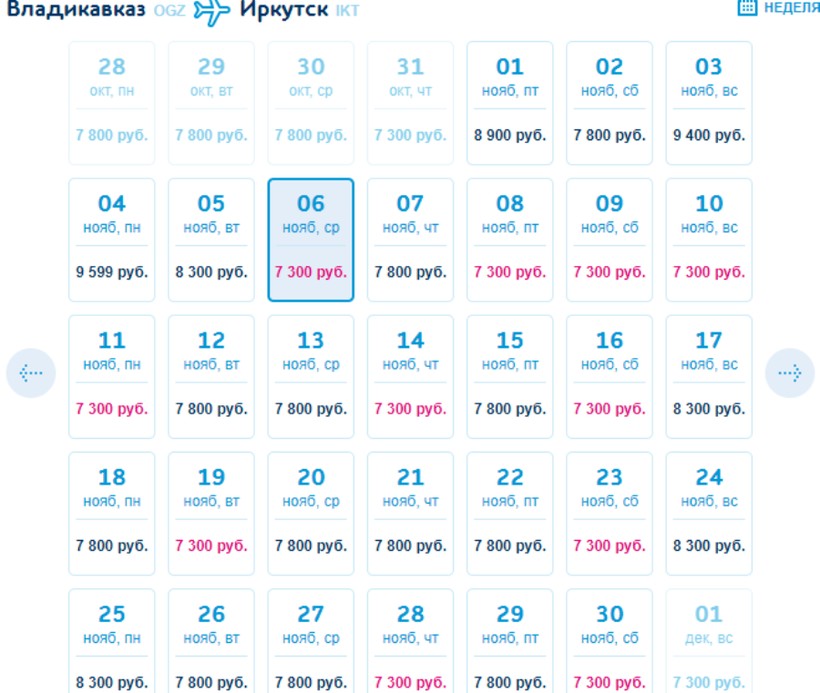 Билеты «туда-обратно» в декабре обойдутся вам всего в 26 874 рубля, а в апреле придется заплатить за них не менее 38 036 рублей. В среднем же, долететь до Иркутска и вернуться во Владикавказ можно за 32 635 рублей.