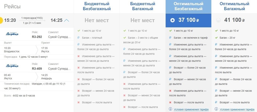 Также авиаузел Хабаровска является зоной бесплатного Wi-Fi-доступа в сеть Интернет. До города и обратно можно доехать на автобусе № 35. Он идет до железнодорожного вокзала. Также у данных авиакомпаний есть и более бюджетный, но в то же время более долгий вариант. На дорогу уйдут одни сутки и пять часов. Стыковки будет две: в Хабаровске (1,5 ч.), Магадане (21 ч.). Билеты за месяц — от 25500 рублей. За 15,5 часов в Анадырь можно попасть с S7 и а/к «Якутия». Маршрут такой: сначала совершите перелет до Якутска вместе с S7. В небе проведете 3,5 часа. Билеты на этот рейс за пару недель стоят от 13900 рублей. У S7 есть как экономкласс, так и бизнес-класс. Самый дешевый тариф называется «Базовый». Включена только ручная кладь (до 10 кг). Авиабилет невозвратный. Далее стыковка в воздушной гавани Якутска продлится немногим более шести часов. Внутри авиагавани есть магазин, кафе, банкоматы, камеры хранения. Следующий перелет выполняет а/к «Якутия». В небе в итоге проведете 5,5 часов. Но будет техническая посадка для дозаправки в Магадане, которая займет 1,5 ч. На этот рейс цены стартуют с 20000 рублей (за пару недель). В итоге за такое авиапутешествие отдадите минимум 34000 рублей. А/к «Якутия» для этого маршрута предлагает четыре тарифа в экономкласс, которые различаются набором опций.