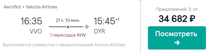 Это минимальная цена, которую может предложить авиакомпания «Якутия», которая выполняет данный перелет со стыковкой в Якутске. На стыковку отводится 1,5 суток. До города и обратно советую добираться на такси. Также будет техническая посадка для дозаправки в Магадане, на которую отводится полтора часа. «Якутия» предлагает только два тарифа в экономкласс. «Оптимальный безбагажный» включает в себя перелет и ручную кладь, ограничение которой по весу составляет 10 кг. Со штрафом разрешен возврат до вылета лайнера. «Оптимальный багажный» уже с багажом (до 20 кг). Со штрафом билет можно вернуть и до вылета, и после отправления самолета. И еще данный вариант перелета доступен только один раз в неделю. Более дешевый и быстрый способ попасть в Анадырь — совершить авиапутешествие с «Аэрофлотом» (по факту полетите с а/к «Аврора») и а/к «Якутия». Общее время в пути — 21 час. Билеты — от 34700 рублей (за пару недель). Обратные обойдутся примерно в такую же сумму.