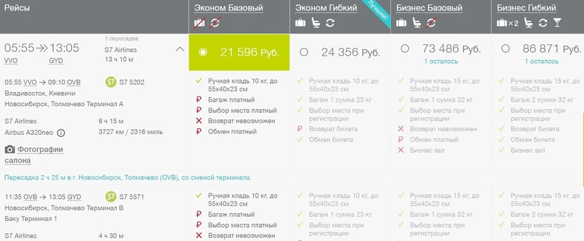 В отсутствие прямых рейсов удобно путешествовать с одной пересадкой и с одной авиакомпанией. Естественно, хочется провести в дороге как можно меньше времени. Для путешествия в столицу Азербайджана выбрала перелет с S7 через Новосибирск, потому что это максимально оперативный способ попасть в Баку. Вдобавок авиакомпания предлагает одни из самых низких цен на транзитные перелеты в данном направлении. Напомню, что за неделю билеты можно приобрести за 21500 рублей при условии, что полетите в экономе (тариф «Базовый»). Единственное неудобство — нужно подстраиваться под расписание компании, потому что этот авиаперелет доступен только два раза в неделю.