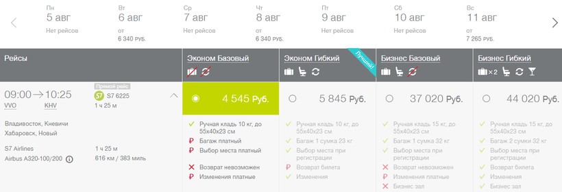 А вот по стоимости полеты с S7 дешевле, чем с предыдущим перевозчиком. Смотрите сами: средняя цена авиаперелета у S7 на ближайшие дни только туда по тарифу «Базовый» 6300–7300 рублей (напомню, у «Авроры» от 10000 ₽), туда-обратно от 10500 ₽. Но уже на вылеты примерно через две недели-месяц авиабилеты стоят от 4500 ₽ (с багажом от 6000 ₽). Полет в бизнес-классе обойдется от 37000 ₽ (на любые даты).