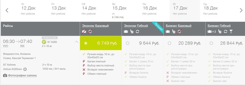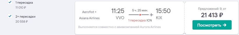 Аврора (HZ 9478) Airbus A319 | 10:30 Владивосток (VVO) | 2 ч. 05 мин | 11:35 Кансай (OSA) | 6 декабря |