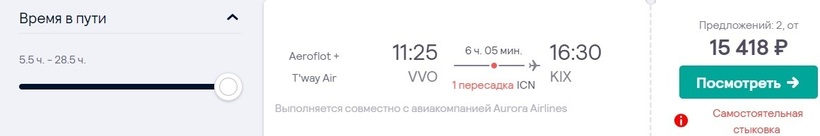 С тем же «Аэрофлотом» (совместно Aurora Airlines) и T'way Air можно добраться до места назначения за 6 часов. Вылет до обеда. Единственный минус данного варианта: самостоятельная стыковка в Сеуле (2 часа). Билет — от 15500 (за 2 месяца).