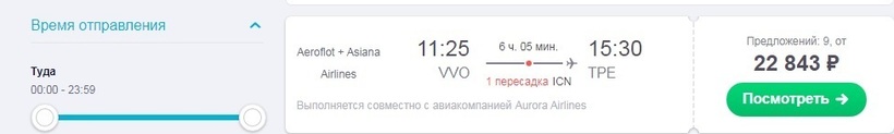 Если нужно потратить минимум времени на дорогу, то я лечу с «Аэрофлотом» (по факту рейс выполняет Aurora Airlines) и Asiana Airlines. На дорогу трачу 6 часов. Стоимость авиабилетов — от 45000 рублей (туда-обратно за 1,5 месяца до вылета). Вариант удобный, на пересадку дается немногим больше часа (не нужно долго сидеть и ждать следующего рейса), как раз хватает, чтобы дойти до транзитной зоны, пройти контроль безопасности (не путайте с таможней, тут просто проверят вас и ручную кладь) и спокойно сесть на самолет.