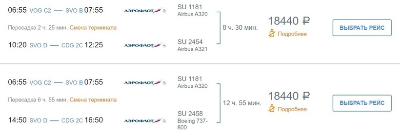 Как я уже говорила, а/к предлагает 18 ежедневных перелетов, оптимальнее всего выбирать рейсы с минимальным временем на стыковки в Москве. Можно вылететь из Волгограда рано утром и уже в обед (по местному времени) оказаться в Париже. Таким образом, стыковка продлится 2,5 часа, а общее время на дорогу — 8,5 часа. Пересадки происходят в Шереметьево. Аэропорт обладает всем необходимым для комфортного ожидания следующего рейса. Внутри аэровокзального комплекса есть: