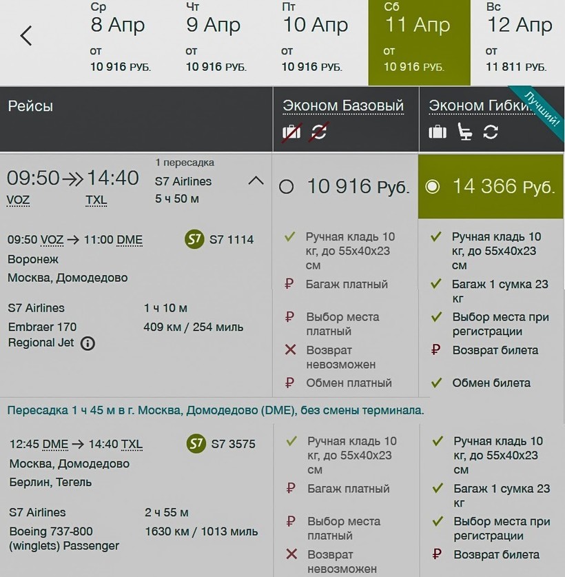 Цены относительно стабильны в течение года (увеличиваются на 3000 ₽ в одну сторону на майские праздники и на некоторые вылеты в выходные дни летом). В случае покупки авиабилетов за значительный срок до даты отправления, рекомендую оформлять перелет по тарифу «Оптимум», потому что он, в отличие от «Лайта», возвратный. S7 Airlines выполняет также ежедневные авиарейсы (вылет утренний). С пересадкой в 2 ч. в Домодедово путешествие занимает 6,5 часа. Преимущество этого оператора перед предыдущим в том, что авиабилеты у него дешевле: на протяжении года с багажом можно купить только туда по цене от 14500 ₽, в обе стороны — от 21000 ₽. Бизнес-класс компания предлагает только на отрезке пути Москва — Берлин, до российской столицы придется лететь в экономклассе. Такое путешествие будет стоить от 34500 ₽. При плохих продажах на ближайшие даты (за пару дней — месяц до вылета) перелет может быть дешевле примерно на 2500 ₽ в одну сторону. Кроме того, сэкономить можно на багаже — стоимость полета только с чемоданом ручной клади ниже на 2500–3500 ₽.