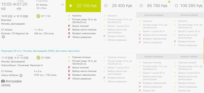 Одновременно более быстрый и дешевый вариант — выбрать в качестве перевозчика только авиакомпанию S7. Весь путь займет на полчаса меньше. Стыковка (1 ч.) также будет в столице РФ, авиаузел тот же — Домодедово. Удобно, что летите по единому авиабилету и регистрацию нужно проходить только один раз — в аэропорту Воронежа. Цены на билеты только туда стартуют с 22100 рублей. И неважно, бронируете их за неделю или несколько дней до вылета.