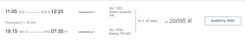 За 14,5 ч. до места назначения можно долететь с «Аэрофлотом» со стыковкой в Москве. Хабом авиакомпании в этом городе является аэропорт Шереметьево. Продолжительность пересадки — около 7 часов. Полетите по единому билету и регистрацию на рейс пройдете один раз в авиагавани Воронежа. Стоимость авиабилетов в одну сторону составляет 20000 рублей. Цена актуальна как за пару недель, так и за полгода до вылета лайнера.