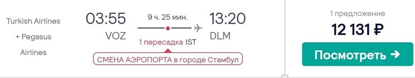 Минус данного варианта заключается в смене аэропорта в Стамбуле. Первый рейс выполняет Turkish Airlines и доставляет в Новый аэропорт Стамбула. Следующий вылет в Даламан будет с Pegasus Airlines из авиаузла Сабиха. Между аэропортами приличное расстояние — 80 километров. Дорога на такси займет примерно 1,5 часа, всего на пересадку дается немногим более пяти часов. Более удобный и популярный вариант — авиаперелет только с Turkish Airlines. Стоимость билетов в одну сторону — от 12100 рублей (за две недели).