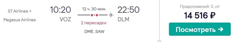 Рейсы Воронеж — Даламан осуществляет только одна авиакомпания - Россия. Минимальная стоимость билета составит 27 155 рублей.