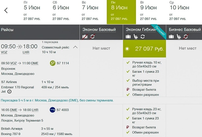 S7 Airlines и British Airways осуществляют совместные авиаперелеты через Домодедово (вылет утренний). С пятичасовой стыковкой путешествие занимает 10 ч. Полет в одну сторону с данными операторами довольно дорогой — с багажом стоит от 27000 ₽. Зато туда-обратно можно купить авиабилеты по цене всего от 24000 ₽. Тариф только с ручной кладью компании не предлагают, как и перелет в бизнес-классе.