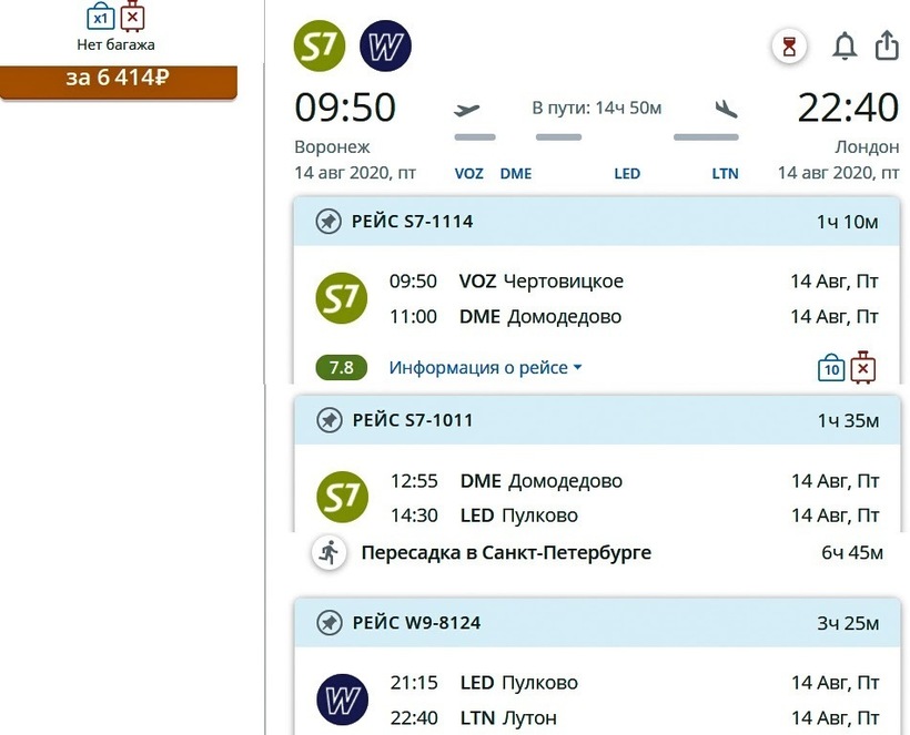 Любителям летать налегке, которые ищут максимально дешевый способ преодоления маршрута, могу рекомендовать авиапутешествие с двумя стыковками. Например, долететь до точки назначения за 15 часов можно с S7 Airlines и Wizz Air с пересадками в московском аэропорту Домодедово и петербургском Пулково (стыковки длятся 2 и 6,5 ч.). Авиабилет только туда будет стоить всего от 6500 ₽.