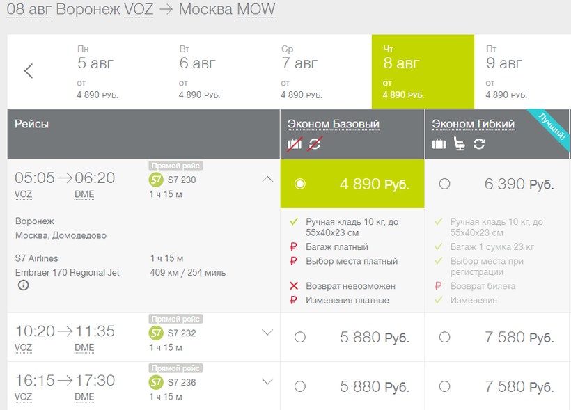 | S7 Airlines (S7 1116) Embraer 170 | 14:40 Воронеж (VOZ) | 1 ч. 15 мин | 15:55 Москва (DME) | 21, 22, 23, 24, 25, 26 марта |