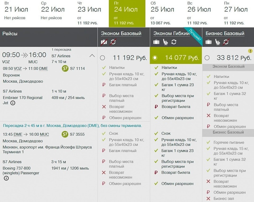 S7 Airlines выполняет ежедневно по одному утреннему рейсу. Со стыковкой в 2,5 часа в Домодедово авиаперелет длится 7 ч. Могу советовать путешествие с этим российским оператором, потому что у S7 есть преимущество перед «Аэрофлотом» по стоимости билетов: только туда с багажом можно купить за 14000 ₽, туда-обратно обойдутся от 22000 ₽ (с ручной кладью — от 11000 ₽ и 17000 ₽ соответственно). В бизнес-классе с S7 можно преодолеть только отрезок пути Москва — Мюнхен, перелет до столицы России доступен лишь в классе эконом. Такой авиабилет стоит от 34000 ₽.