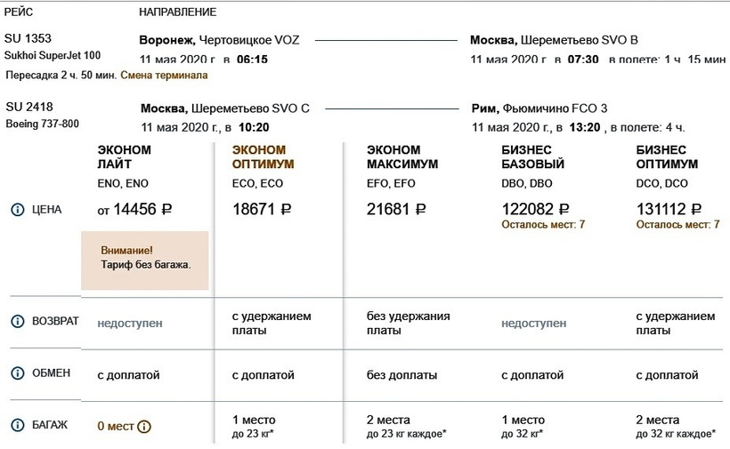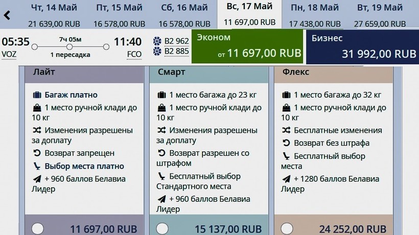 Рейсы Воронеж — Рим осуществляет только одна авиакомпания - Сибирь. Минимальная стоимость билета составит 30 138 рублей.
