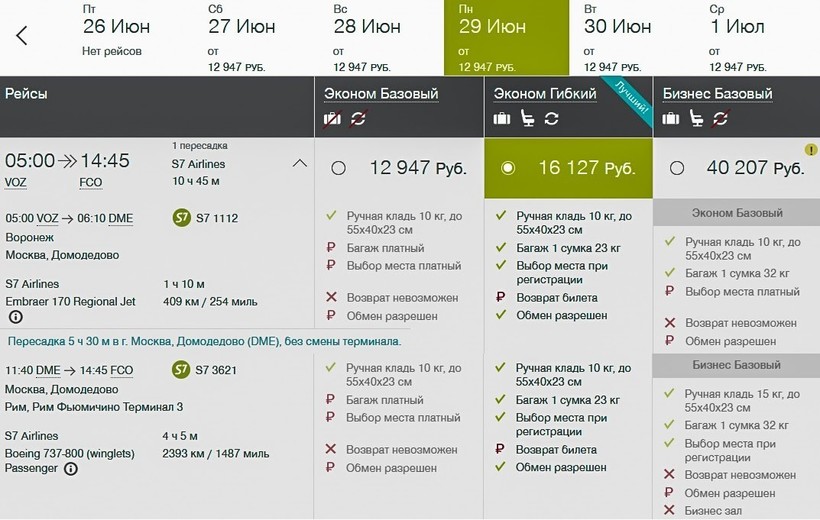 Цены актуальны примерно в течение года, увеличиваются только на вылеты перед новогодними и рождественскими праздниками на 2000–8000 ₽. На этот период могу советовать покупать билеты заранее. S7 Airlines значительно уступает вышеупомянутой российской компании по графику авиарейсов: с апреля по ноябрь оператор выполняет полеты по понедельникам, вторникам, четвергам, пятницам и воскресеньям, в остальные месяцы — во все дни, кроме вторника и пятницы. Рекомендую путешествие на крыльях S7 в период с апреля по ноябрь, когда со стыковкой в Домодедово в 5,5 часа перелет занимает около 11 ч. В зимне-весенний период пересадка длится 13 ч., а общее время в пути составляет 18,5 часа, что очень долго. Стыковка ночная, и придется оплатить ночлег в гостинице. У S7 есть преимущество перед «Аэрофлотом» в стоимости билетов: только туда с багажом обойдутся от 16000 ₽, в обе стороны — от 24000 ₽. Полет в бизнес-классе перевозчик предлагает между российской и итальянской столицами, а долететь до Москвы можно только в классе эконом. Такой вариант преодоления пути будет стоить от 40000 ₽.
