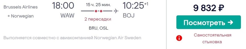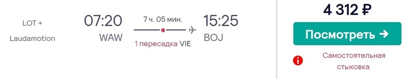В столице Норвегии стыковка самостоятельная. Нужно забрать и сдать заново багаж, пройти регистрацию на следующий рейс до Бургаса. Более популярный вариант — перелет с LOT и Laudamotion, потому что дорога до Бургаса займет 7 часов. Билеты купите за 4300 рублей (за 1,5 месяца). Стыковка в Вене — 3,5 ч.