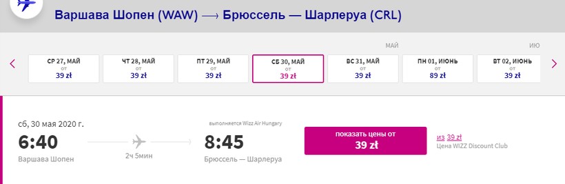 Во время своих европейских поездок я часто обращаюсь к бюджетным перевозчикам. Венгерский лоукостер перевозит своих клиентов из Варшавы в Брюссель один раз в сутки, вылет утренний.