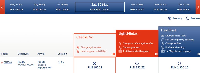 Минимальная цена билета составляет 166 польских злотых (приблизительно 3000 рублей). В поисках выгодных предложений я просмотрела цены оператора на несколько месяцев вперед и могу рекомендовать оплачивать путешествие заранее, минимум за месяц до отлета. А вот платить за поездку туда и в обратном направлении одновременно смысла не вижу, так сэкономить не получится. Перевозчик предлагает своим клиентам три тарифа.