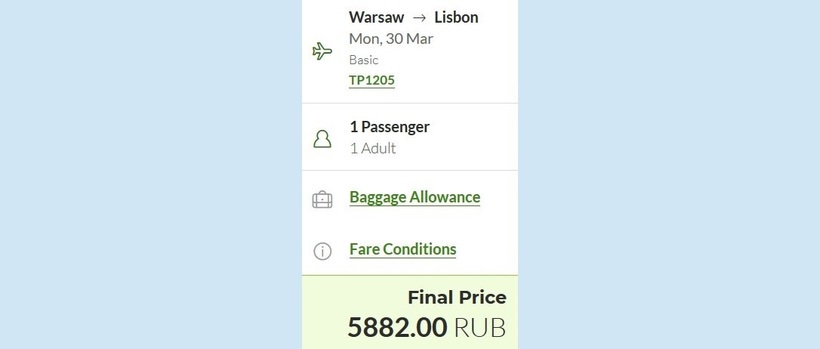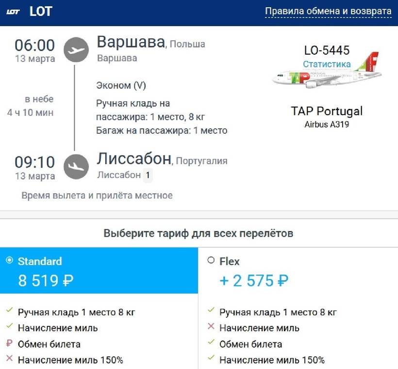 Билеты по такой стоимости доступны в низкий сезон (с ноября по апрель). В июле — августе путешествие с вещами обойдется в 9000 ₽. Покупка обратного билета заметной экономии не дает — перелет туда и обратно летом обходится в 18000 ₽. Бизнес-класс стоит примерно 15000–18000 ₽, в некоторые дни это дешевле, чем полет в экономклассе. Предложение неплохое — с гибкой тарифной системой, разумными ценами, нормальным весом багажа. Главный минус — бедное расписание. LOT Polish Airlines — национальный перевозчик Польши предлагает билеты на рейс, выполняемый TAP Portugal. Таким образом, расписания у компаний совпадают. Но тарифная система немного другая.