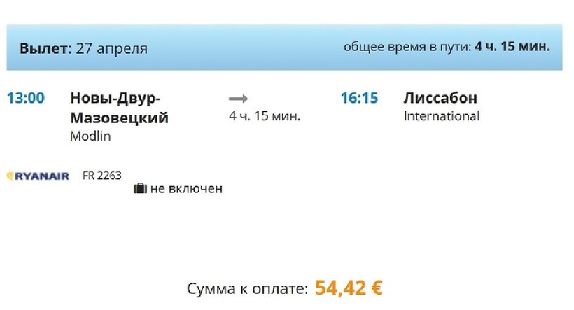 Ryanair (FR 2263) Boeing 737-800 | 18:30 Варшава (WMI) | 4 ч. 20 мин | 21:50 Лиссабон (LIS) | ср с 01.04 |