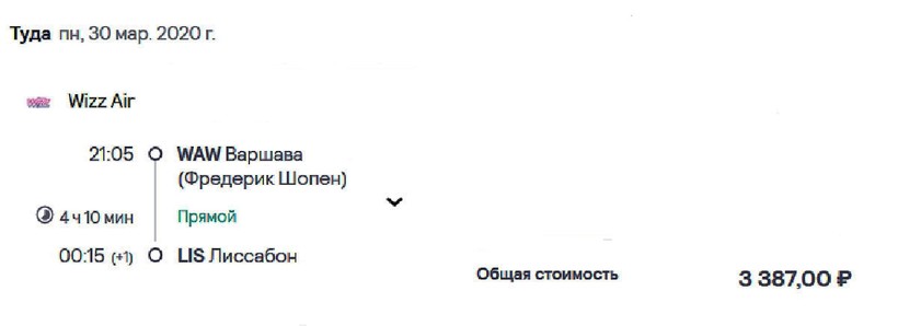 Wizz Air (W6 1593) Airbus A320 | 20:50 Варшава (WAW) | 4 ч. 20 мин | 00:10 Лиссабон (LIS) | 3, 10, 17, 24 октября, 30 марта, 3, 6, 10, 13, 17, 20, 24, 27 апреля, 1, 4, 8, 11, 15, 18, 22 мая, … |
