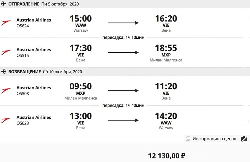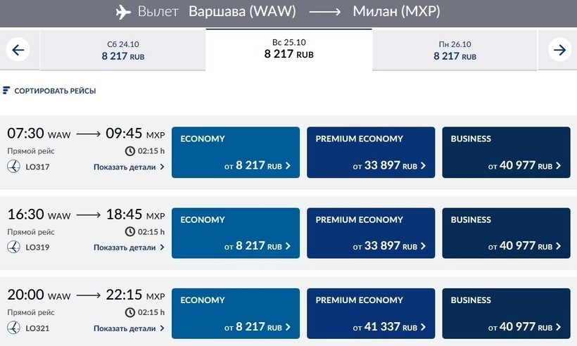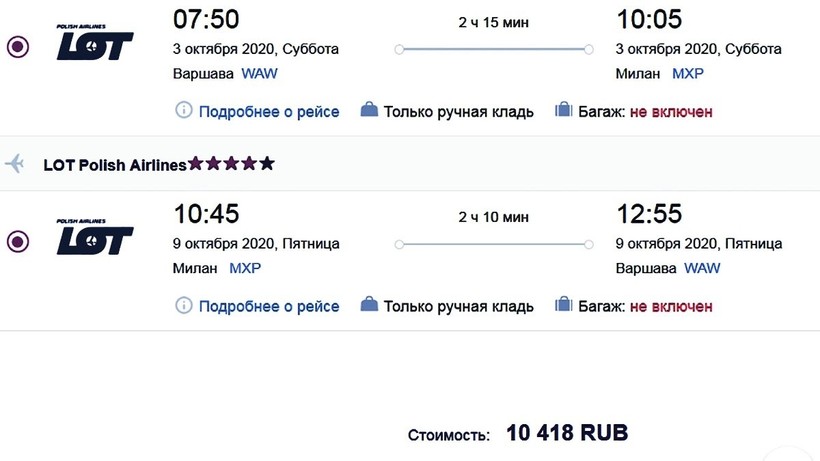 | Lot (LO 317) | 07:35 Варшава (WAW) | 2 ч. 10 мин | 09:45 Милан (MXP) | 20 октября |