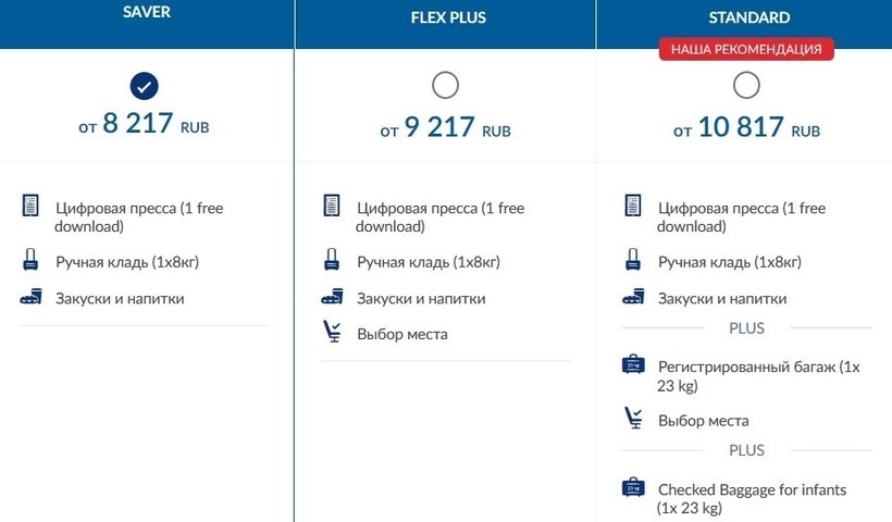 Standard — включены ручная кладь и багаж весом до 23 кг, также есть возможность менять даты бронирования или отказаться от полета.