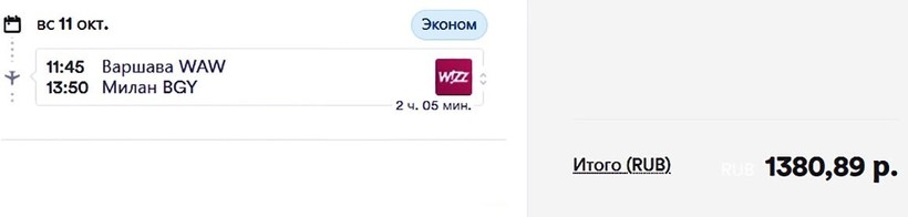 | Lot (LO 319) Embraer 195 | 16:35 Варшава (WAW) | 2 ч. 15 мин | 18:50 Милан (MXP) | 20 октября |