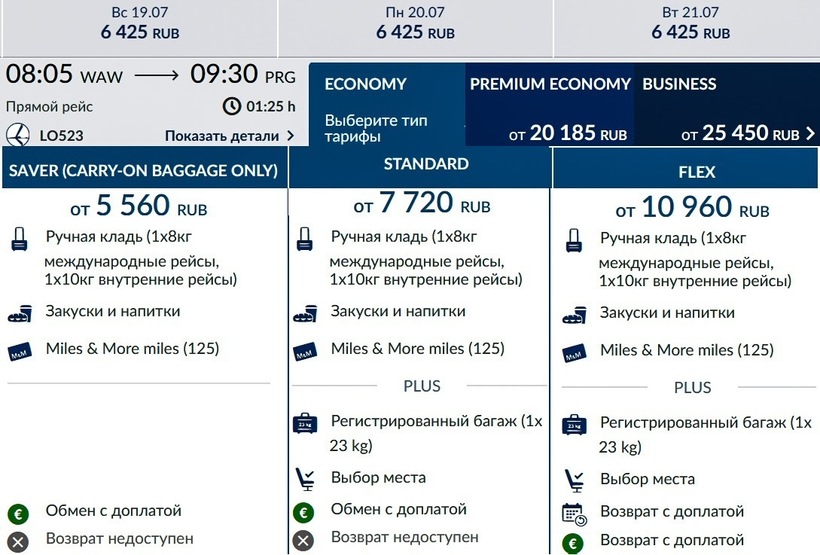 Самолеты LOT летают каждый день по пять раз (дважды утром, днем и дважды вечером), что позволяет вылететь по маршруту в наиболее подходящее время. Билеты у перевозчика отнесу к недорогим: в одну сторону с багажом можно купить за 7700 ₽, туда-обратно авиаперелет стоит всего от 8900 ₽. С ручной кладью (разрешен провоз чемодана весом до 8 кг) путешествие обойдется от 5500 ₽ и 6200 ₽ соответственно. Проездной в бизнес-класс авиаоператор предлагает по цене от 25500 ₽.