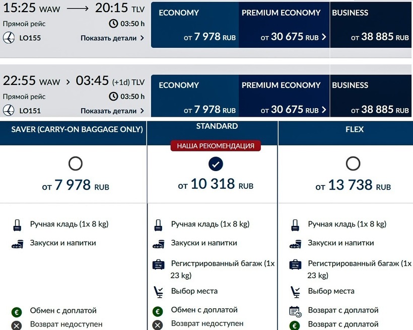 Lot (LO 1151) Boeing 737 | 12:05 Варшава (WAW) | 3 ч. 50 мин | 16:55 Тель-Авив (TLV) | 7 октября |