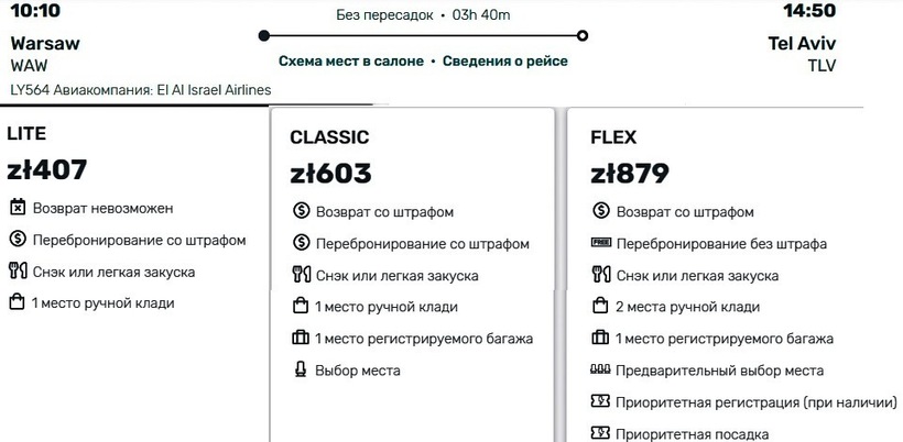 El Al уступает польскому перевозчику по графику полетов — израильская компания выполняет по одному-два авиарейса во все дни недели, за исключением субботы (с ноября по апрель — еще и кроме вторника). У данного авиаоператора билеты немного дешевле, чем у вышеописанного: в среднем в одну сторону с багажом стоят 9000–10500 ₽ (510–605 злотых), туда-обратно — от 17500 ₽ (1000 злотых). Авиапутешествие с ручной кладью обойдется от 5500 ₽ и 11500 ₽ соответственно. Бизнес-класс — от 49000 ₽.