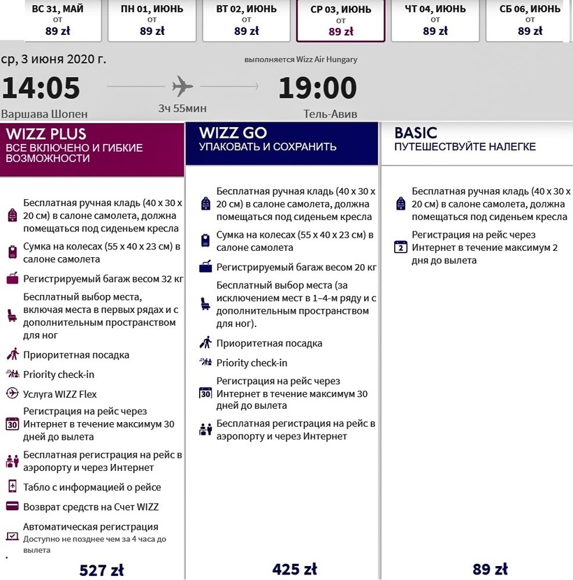 Самолеты Wizz Air летают ежедневно. Авиарейс дневной. Поскольку это лоукостер, он предлагает одни из наиболее дешевых билетов по направлению: в весенне-летний период преодолеть путь только туда с ручной кладью можно в среднем за 1600–3000 ₽ (90–170 злотых), в обе стороны — от 3500 ₽ (205 злотых). Как и у вышеописанных перевозчиков, увеличивается цена авиаперелета на осенне-зимнее время: в одну сторону билеты стоят 3800–7000 ₽ (210–395 zł), туда-обратно — от 8500 ₽ (475 zł). Кроме того, советую бронировать авиабилеты заранее на новогодние и рождественские праздники, потому что с середины декабря по январь стоимость полета только туда может доходить до 10000 ₽ (565 zł). К недостаткам данного бюджетного оператора отнесу дорогой провоз багажа — обойдется от 6000 ₽ (335 zł).