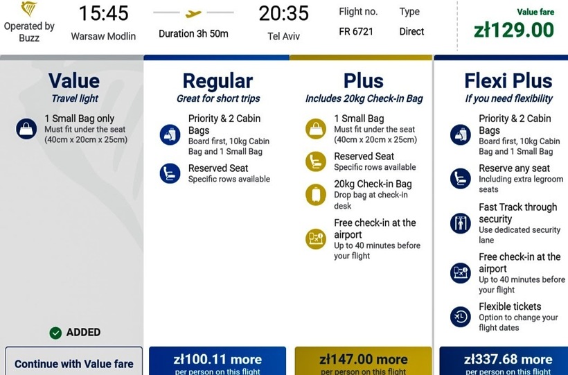 С Ryanair можно преодолеть путь только по понедельникам, средам, пятницам и воскресеньям. Вылет дневной. У данного лоукостера в весенне-летний период авиабилеты только туда с ручной кладью обойдутся в 2300–3300 ₽ (130–185 zł), в осенне-зимний — в 4000–5600 ₽ (225–315 zł). Путешествие в обе стороны будет стоить от 4600 ₽ (260 zł) и 6000 ₽ (340 zł) соответственно. Главная причина, по которой я советую полет с этой бюджетной авиакомпанией, заключается в том, что у Ryanair стоимость провоза багажа ниже, чем у предыдущего лоукостера — стоит 2600 ₽ (147 zł).