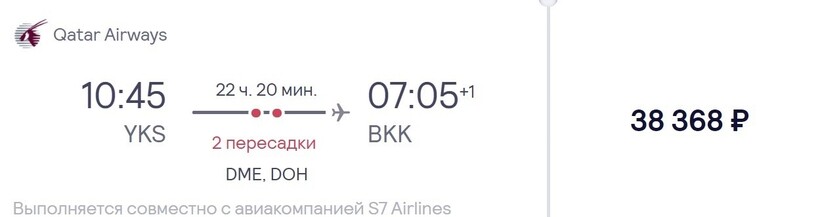 Прямое авиасообщение между городами отсутствует. Транзитом в столицу Таиланда можно попасть, например, на лайнерах авиакомпаний S7 Airlines и Qatar Airways. В дороге до места назначения проведете около суток. Две стыковки в Москве (Домодедово) и Дохе (Хамад) займут в общей сложности 3,5 часа. За три месяца до вылета авиабилеты купите за 38400 рублей. Это минимальная цена, которую предлагают авиаперевозчики.