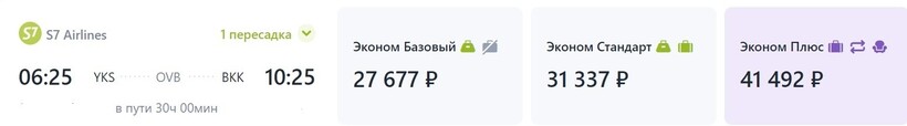 Весь путь займет сутки и шесть часов. Стыковка в Новосибирске (аэропорт Толмачево) будет длительной — 18,5 ч. На борту лайнеров S7 на этом маршруте есть только экономкласс. Компания предлагает на выбор три тарифных плана, которые различаются не только опциями, но и ценами. Самый бюджетный авиатариф «Базовый» включает провоз только ручной клади (до 10 кг) и подойдет вам, если летите без лишних вещей. Тарифный план «Стандарт» включает следующие опции:
