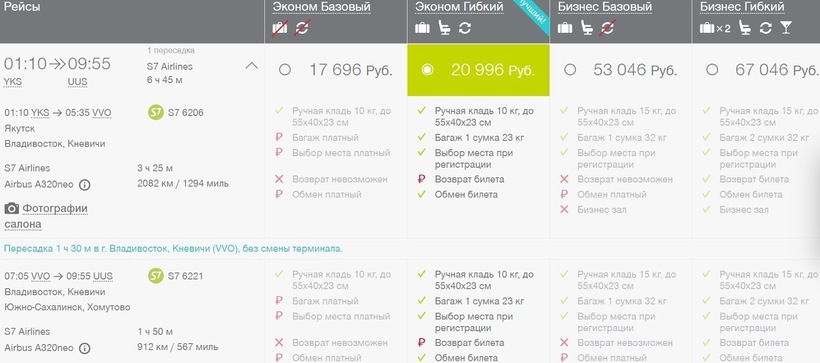 Прямые перелеты по этому маршруту не предлагает ни одна авиакомпания. Если согласны потратить на дорогу около семи часов, до конечного пункта можно добраться, купив билеты только туда за 17700 рублей (за неделю). Перевозчиком является а/к S7. Данный перелет доступен только два раза в неделю. Пересадка происходит во Владивостоке (аэропорт Кневичи). На нее дается 1,5 часа. У S7 есть два тарифа в экономкласс. Стартовый тариф называется «Эконом Базовый». По его условиям на борт можно взять только ручную кладь, ограниченную по весу 10 кг. Билет невозвратный. Более продвинутый тариф — «Эконом Гибкий» дороже предыдущего на 20%, но уже позволяет взять багаж (до 23 кг). Плюс можно вернуть билет со штрафом и бесплатно выбрать место в салоне лайнера. В бизнес-класс перевозчик предлагает два тарифа с разным набором опций. Цены стартуют с 53000 рублей (за неделю).
