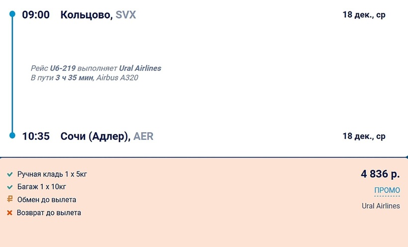 Уральские авиалинии (U6 523) Airbus А320 | 14:35 Екатеринбург (SVX) | 4 ч. 00 мин | 16:35 Сочи (AER) | 5 января |