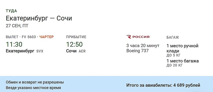 Россия (FV 6122) Boeing 737-800 | 07:25 Екатеринбург (SVX) | 3 ч. 55 мин | 09:20 Сочи (AER) | 29 марта |