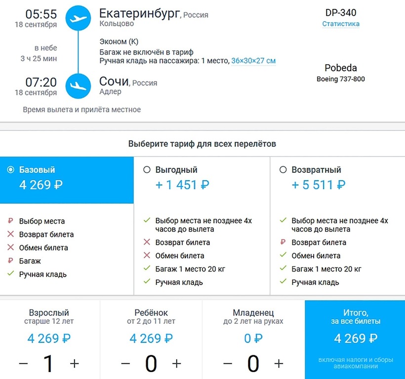 Тем, кто ищет совсем уж дешевый рейс, а вещей везет мало, советую обратить внимание на ежедневный полет авиакомпании «Победа» — российского лоукостера. Если купить билет за две недели до вылета, то вы заплатите всего 4000 ₽. Это по тарифу «Базовый» — вес вещей не более 5 кг, выбор места платный, отмена полета невозможна. Если брать тариф «Выгодный» за 5700 ₽, то можно взять багаж до 20 кг, а также выбирать место.