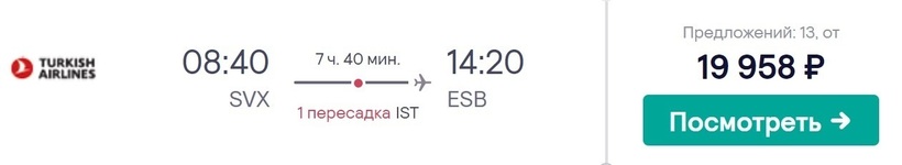 Билеты «туда-обратно» в декабре обойдутся вам всего в 21 357 рублей, а в апреле придется заплатить за них не менее 39 394 рубля. В среднем же, долететь до Анкары и вернуться в Екатеринбург можно за 30 244 рубля.