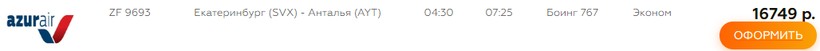Azur Air (ZF 3037) Boeing 767-300 | 09:50 Екатеринбург (SVX) | 5 ч. 20 мин | 13:10 Анталия (AYT) | 2 ноября |