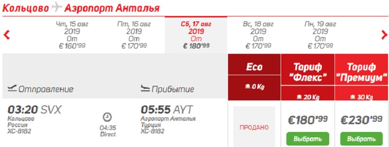 Аэрофлот (SU 792) Airbus A320 | 02:20 Екатеринбург (SVX) | 5 ч. 20 мин | 05:40 Анталия (AYT) | 1 октября |