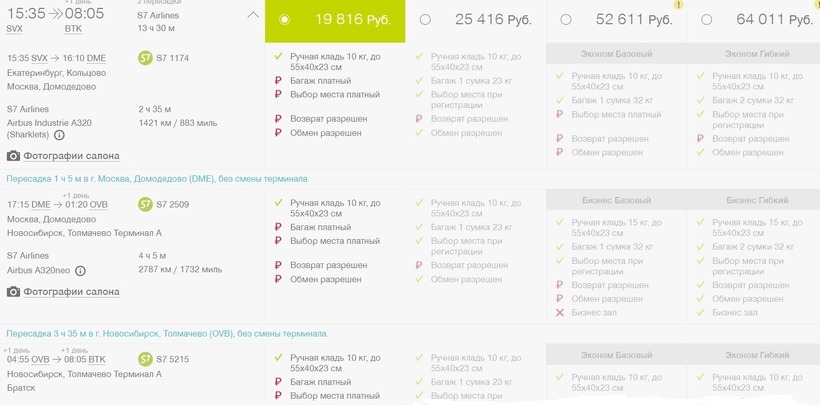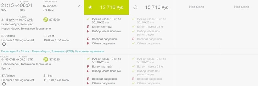 Ежедневно из Екатеринбурга совершается немало транзитных перелетов в Братск — прямые самолеты в этот город не летают. Расскажу про самые актуальные варианты. Авиакомпания S7 — один из крупнейших авиаперевозчиков страны — осуществляет перелеты в Братск через Новосибирск (аэропорт Толмачево). Продолжительность максимально удобного перелета составляет 7 часов и 45 минут. В это время включена и трехчасовая стыковка в Новосибирске. Смена терминала в воздушной гавани не требуется. Теперь про стоимость авиабилетов. Цены стартуют с 12700 рублей (за неделю). Для этого маршрута перевозчик предлагает только экономкласс — два тарифа, которые различаются по набору опций. «Эконом Базовый» — стартовый и, соответственно, самый дешевый тариф. Он с минимальным набором опций — включена только ручная кладь, багаж за дополнительную плату. «Эконом Гибкий» — более продвинутый, и в большинстве случаев я беру именно его. Его условия: