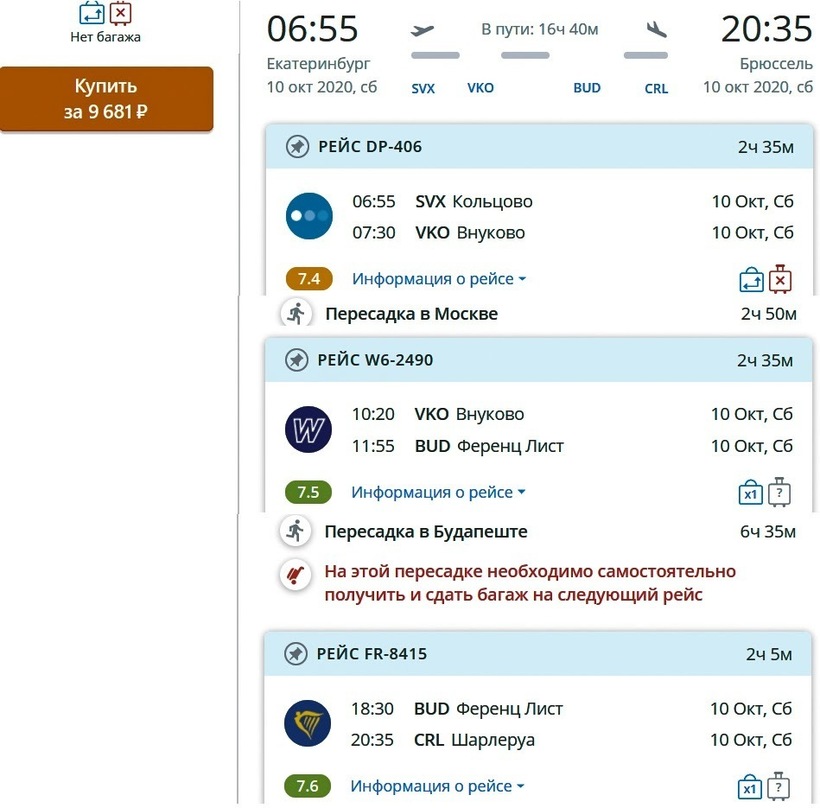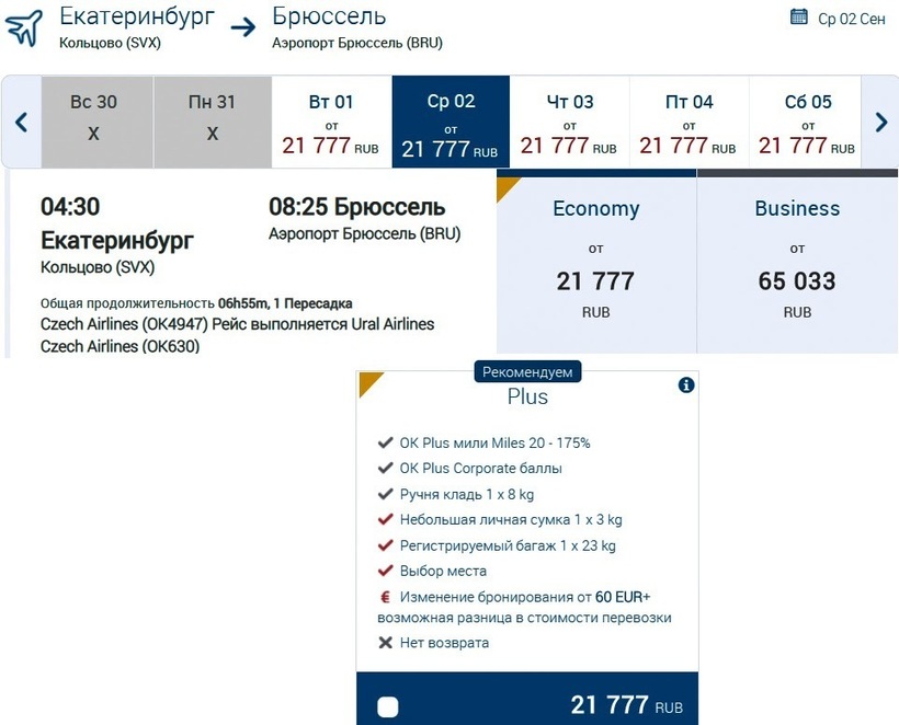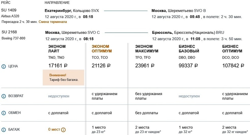 | Уральские авиалинии (U6 3981) | 13:35 Екатеринбург (SVX) | 5 ч. 25 мин | 16:00 Брюссель (BRU) | только 30 августа |