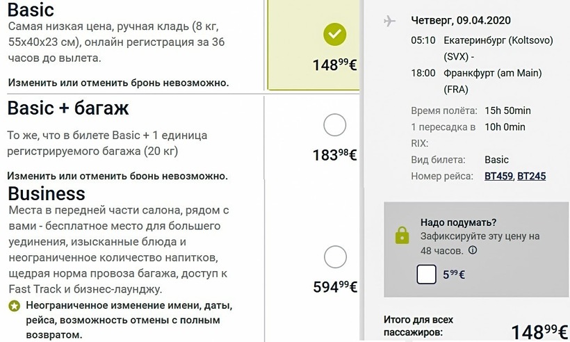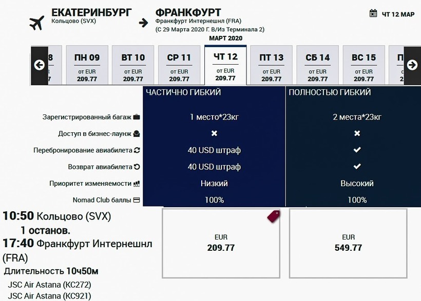 Я летала по маршруту весной и выбрала для себя путешествие с Air Astana — на билетах туда-обратно мне удалось сэкономить 5500 ₽, по сравнению с «Аэрофлотом», и 1500 ₽, по сравнению с «Турецкими авиалиниями». Кстати, у крупнейшего авиаперевозчика Казахстана и самый недорогой бизнес-класс по направлению. Учитывая то, что рейсы у Air Astana не ежедневные, в дни, когда самолеты казахской авиакомпании не летают, советую предпочесть путешествие с авиакомпанией Turkish Airlines, цены у которой дешевле аэрофлотовских. Тем, для кого скорость преодоления пути не играет существенной роли, в период осуществления перелетов airBaltic рекомендую летать с этой компанией, авиабилеты у которой самые дешевые (как с ручной кладью, так и с багажом). А предпочесть полет с «Аэрофлотом» следует тем, кому нужно попасть во Франкфурт максимально быстро и в определенный день, потому что у российского перевозчика самое удобное расписание полетов.
