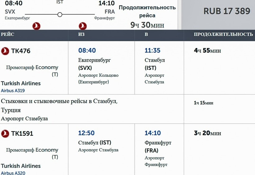 Прямое авиасообщение между Екатеринбургом и Франкфуртом-на-Майне не налажено, но между городами ежедневно осуществляется несколько десятков транзитных рейсов. Удобнее всего преодолевать путь с одной пересадкой, и такие варианты стыковочных перелетов предлагают: